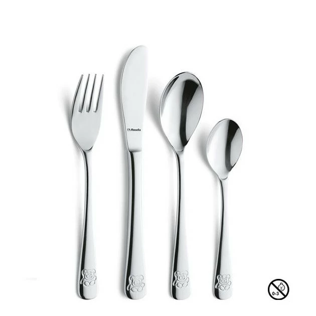 A la fois sobre et personnalisé pour les enfants, ce lot de 4 couverts Amefa dispose d’un motif ourson gravé sur le manche de ces derniers. Fabriqués en inox 18/10, ces couverts de table pour enfants sont parfaits pour accompagner le repas de vos enfants de 3 à 6 ans.