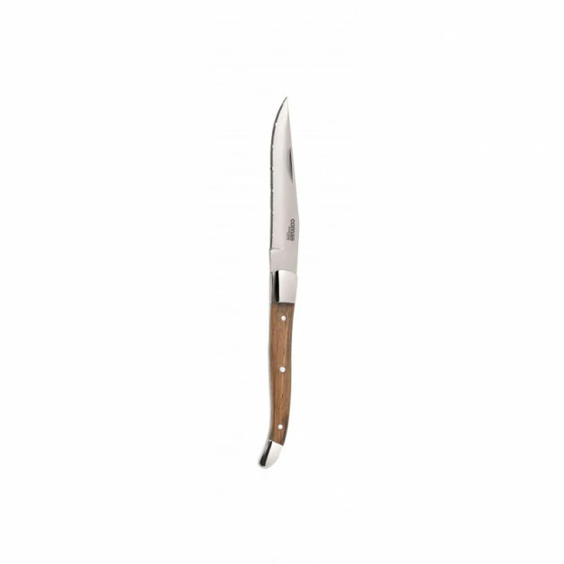 Fait en bois, le manche du couteau à steak ALPS Comas est fixé par 3 rivets. Entre la lame et le manche se trouve la mitre de tête, tandis que la mitre de pied se trouve à l’opposé de la lame. La première apporte de l’équilibre au couteau à viande ALPS Comas et protège la lame en cas de chute, alors que la seconde vise à protéger le manche.