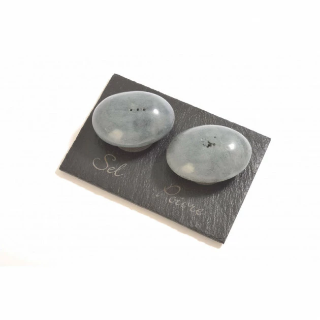La salière et le poivrier ont la forme de galets ou de pierres chaudes et sont présentés sur une ardoise noire gravée au laser, qui vient souligner la finesse de ce set Sel et Poivre.