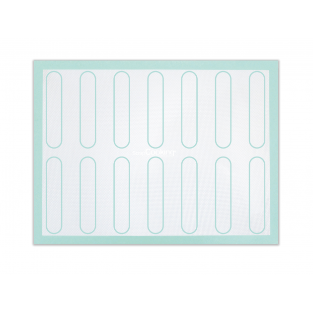 D’une dimension de 30 par 40 cm de côté, cette toile de cuisson regroupe d’un côté les emplacements parfaits pour vos choux et macarons pour une cuisson optimale. De l’autre côté du tapis de cuisson silicone vous trouverez le gabarit idéal pour réaliser 14 éclairs.